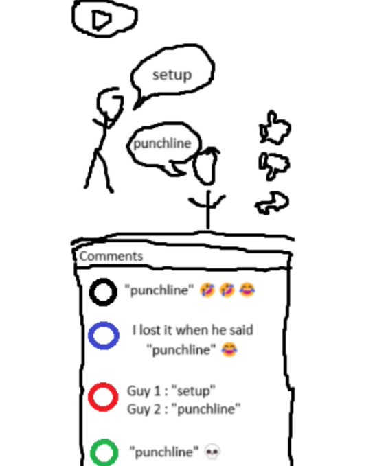 setup punchline Comments "punchline" I lost it when he said "punchline" Guy 1: "setup" Guy 2: "punchline" "punchline"