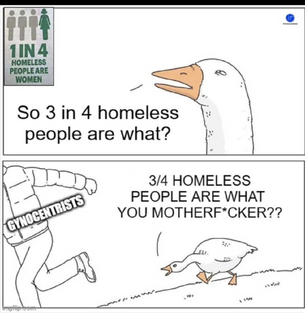 1 IN 4 HOMELESS PEOPLE ARE WOMEN. So 3 in 4 homeless people are what? GYNOCENTRISTS. 3/4 HOMELESS PEOPLE ARE WHAT YOU MOTHERF*CKER??