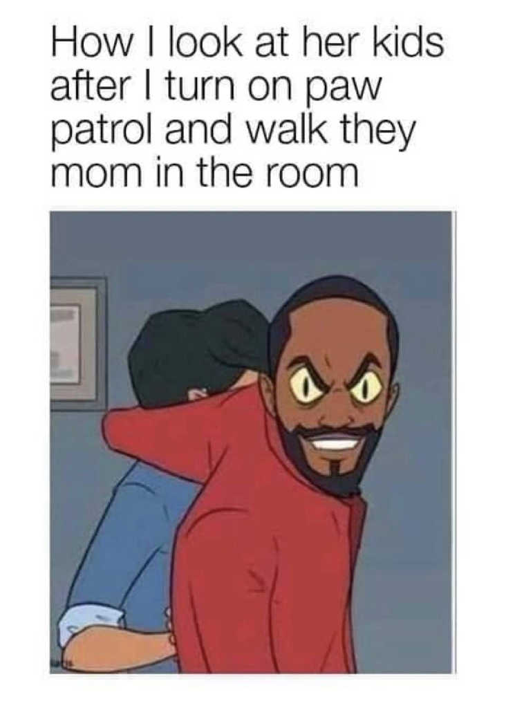 How I look at her kids after I turn on paw patrol and walk they mom in the room