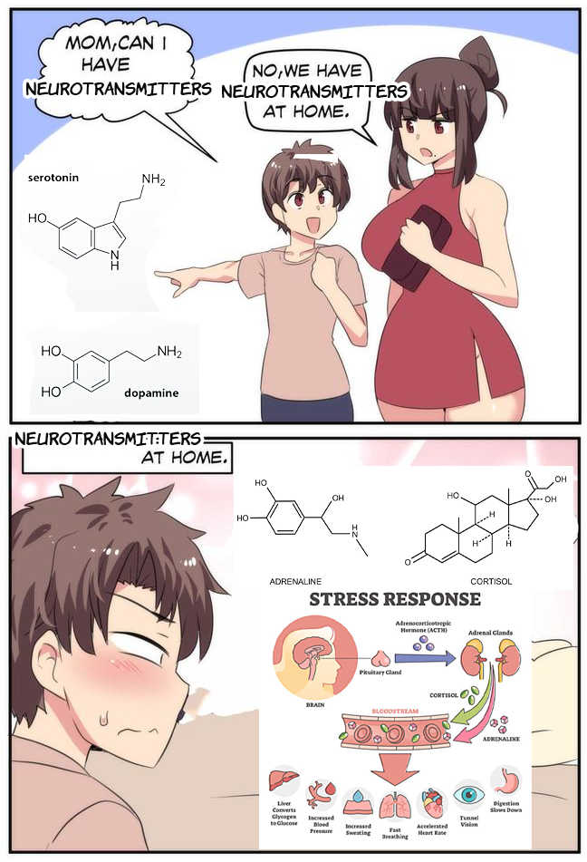 MOM,CAN I HAVE NEUROTRANSMITTERS. NO,WE HAVE NEUROTRANSMITTERS AT HOME. serotonin, dopamine, NEUROTRANSMITTERS AT HOME. ADRENALINE, CORTISOL, STRESS RESPONSE