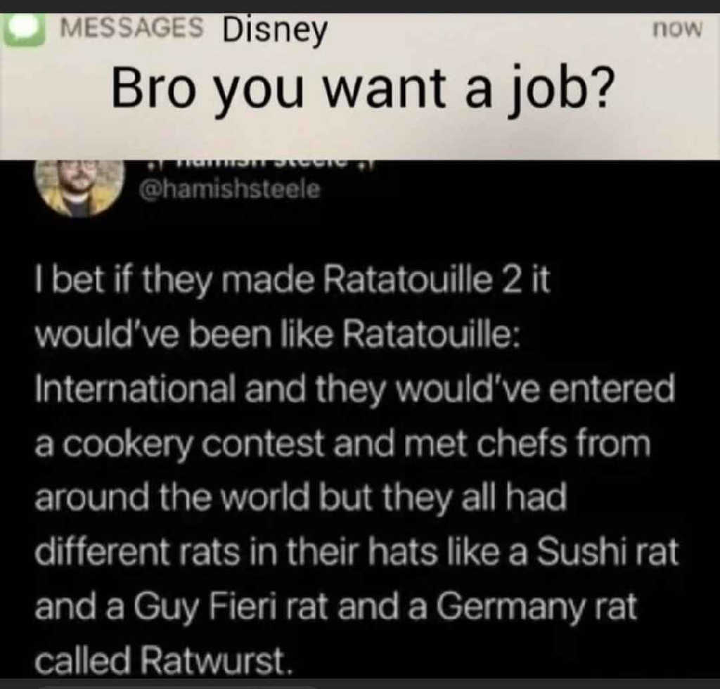 MESSAGES Disney now Bro you want a job? @hamishsteele I bet if they made Ratatouille 2 it would've been like Ratatouille: International and they would've entered a cookery contest and met chefs from around the world but they all had different rats in their hats like a Sushi rat and a Guy Fieri rat and a Germany rat called Ratwurst.
