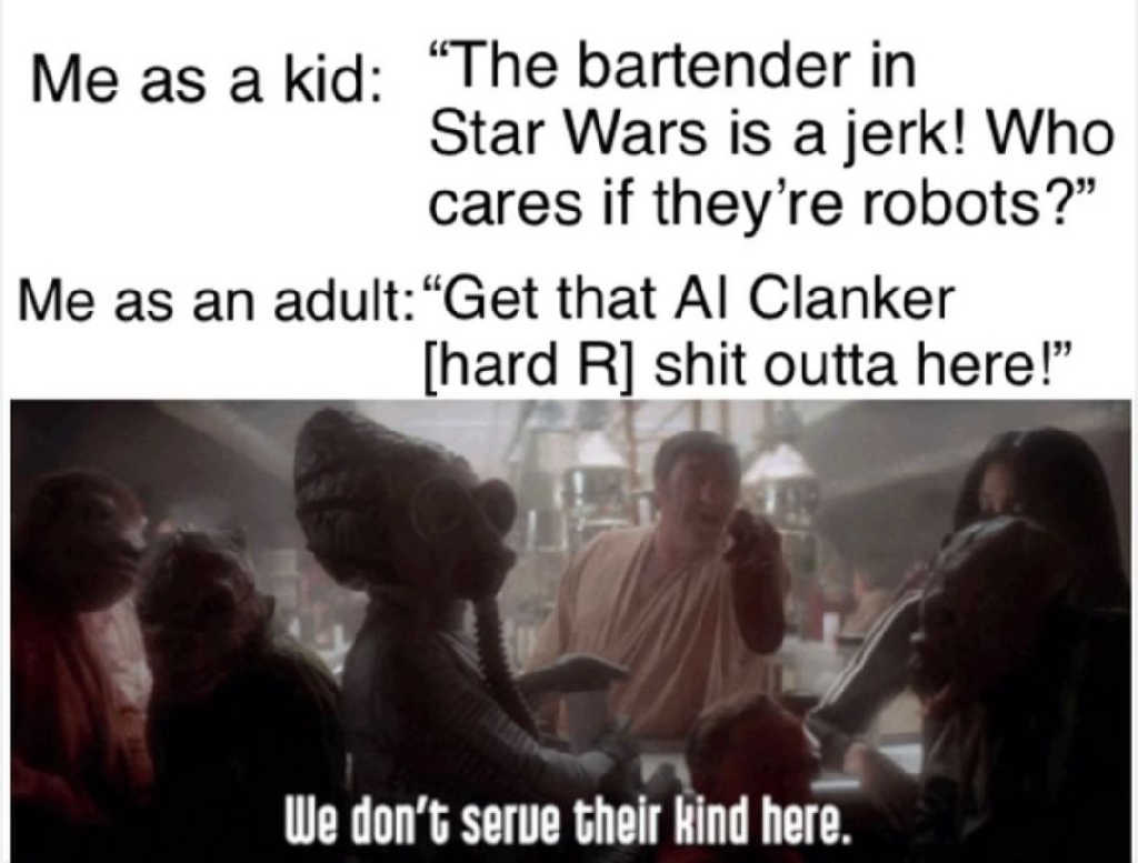 Me as a kid: “The bartender in Star Wars is a jerk! Who cares if they're robots?" Me as an adult: "Get that Al Clanker [hard R] shit outta here!" We don't serve their kind here.