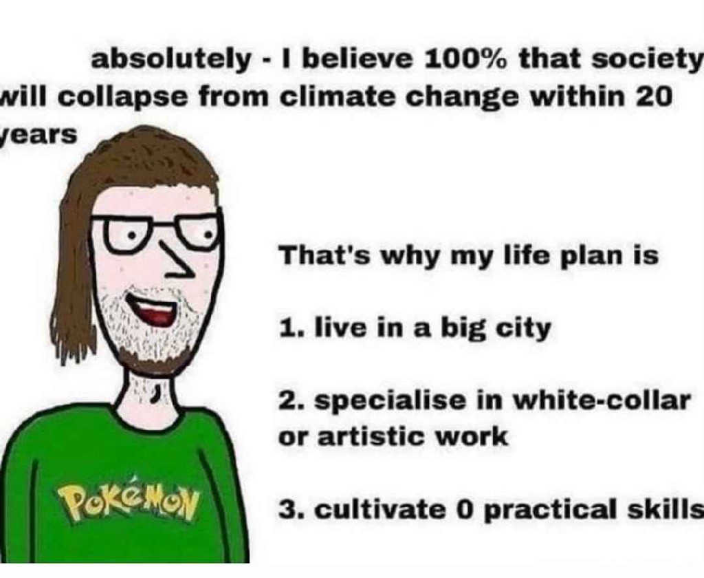 absolutely - I believe 100% that society will collapse from climate change within 20 years. That's why my life plan is 1. live in a big city 2. specialise in white-collar or artistic work 3. cultivate 0 practical skills