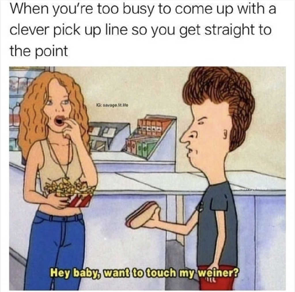 When you're too busy to come up with a clever pick up line so you get straight to the point. Hey baby, want to touch my weiner?