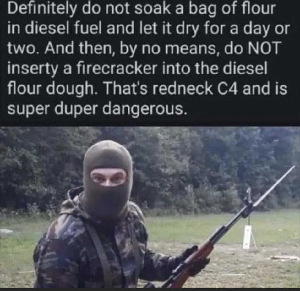 Definitely do not soak a bag of flour in diesel fuel and let it dry for a day or two. And then, by no means, do NOT inserty a firecracker into the diesel flour dough. That's redneck C4 and is super duper dangerous.